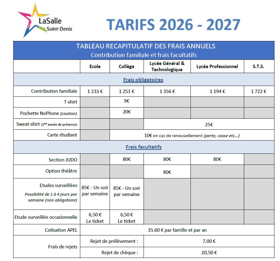 TARIFS 2026-2027 Récapitulatif des frais annuels Pour plus de détail, cliquer sur ce lien :Tarifs 2026-2027